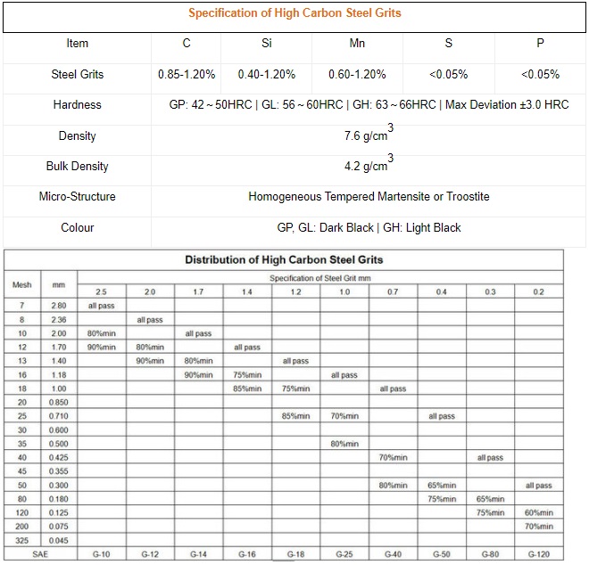 In accordance with standards of GB/T18838.3-2008 Steel Shot and Steel Grit,SFSA20-66Cast Steel Abrasive, SAE J827 Cast Steel Shot, SAE J1993High Carbon Steel Grit, YB/T5149-1993 Cast Steel Shot, YB/T5150-1993Cast Steel Grit,ISO11124-3High Carbon Cast Steel Shot and Grit.