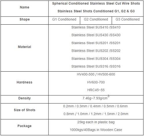 Stainless Steel Shots conditioned, which is also called for Spherical conditioned stainless steel Cut Wire Shots, is made by stainless steel wire after cutting and conditioning process. During the process, we can obtained several conditioned forms G1 (normal conditioned), G2 (double conditioned) and G3 (special conditioned), where G3 is the perfect rounded particle.
